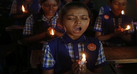 (Indian students pray for boys and their soccer coach who have been trapped since June 23, in Mae Sai, Chiang Rai province, northern Thailand, at a school in Ahmadabad. AP Photo)
