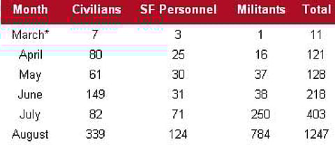 A survival-fixated government led by Gilani has also come under immense and multiple pressures. Prominent among these is the enduring militancy across the country and the concomitant failure to stem the progression of entrenched forces of extremist Islam. In 2008, so far, it has been unambiguously demonstrated that the flag of extremist Islam continues to flail vigorously and violently across Pakistan, even as state agencies appear less in control, and more vulnerable. There have been some 3,220 militancy-related fatalities across Pakistan in 1,810 incidents in 2008 (data till August 31). This includes 1,118 civilians, 451 security force (SF) personnel and 1,651 militants. By comparison, the whole of 2007 witnessed approximately 3,599 killings, including 1,523 civilians, 597 SF personnel and 1,479 militants. In fact, August 2008 with 1,247 fatalities, including 339 civilians and 784 militants, has been the most violent month on record (according to the ICM database). [It is useful to reiterate that, given Islamabad's understated accounts, the suppression of the Press and erratic reportage from all the conflict zones, the actual numbers of fatalities could be considerably higher than those indicated above].
