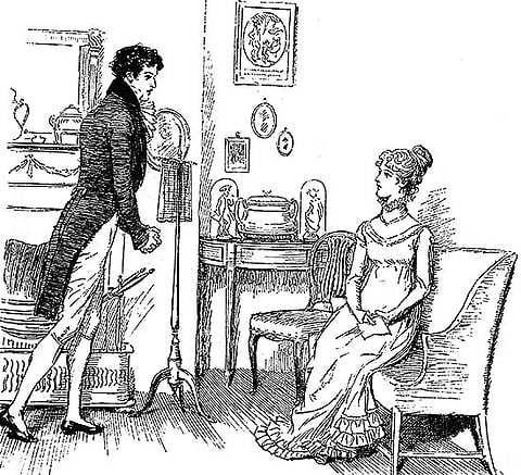 Darcy proposes to Elizabeth in Hugh Thomson’s illustration for an 1894 edition of Pride and Prejudice; left, the famous sketch of Jane Austen