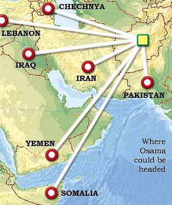 Sheer accessibility would make Pakistan his first choice. Here the Taliban has a network of madrassas and a veritable army of those who consider bin Laden their hero. But he will have to rule that out because the Pakistan government, which has now changed its policy on Afghanistan, would be too willing to hand him over to Washington and earn a few more brownie points. But bin Laden could also emulate a group of fanatic Arabs who in 1999 sought refuge with the independent-minded Afridi tribes in the remote Tirah valley in Pakistan's Khyber Agency. But the Afridis soon objected to the presence of Arabs and their religious practices and promptly threw them out. They would now be averse to sheltering a more notorious Arab than his predecessors.