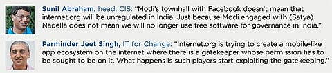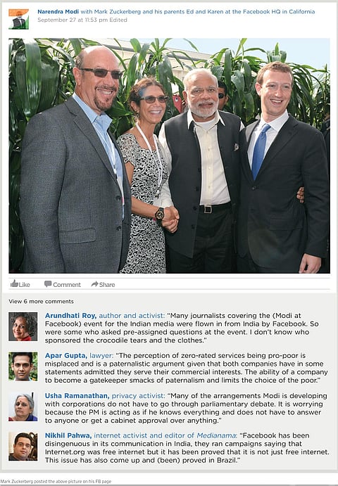 True to form—and Facebook—there was a warm, friendly and familial feel to Prime Minister Narendra Modi’s townhall meeting at Melon, California, with Mark Zuckerberg on September 27. Modi got emotional (yet again) while talking about his mother. Zuckerberg, the youngish founder of the world’s largest social networking site, got his parents to meet and pose with Modi. “The most amazing moment was when I talked about our families,” Zuckerberg wrote in a post, “and he (Modi) shared stories of his childhood....” That’s just the kind of stuff we would see and post on Facebook—the benign visage of a profitable, all-pervasive US-based corporation. (Needless to say, everyone who has worked on this story is a registered user).