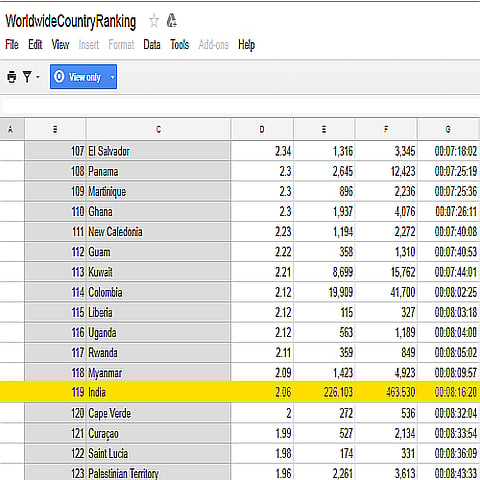 India ranks 119 out of 189 countries, as revealed by data collected by cable.co.ok which compiled the global speed league of 189 countries collected over a year until May following a research partnership with New America's Open Technology Institute, Google Open Source Research and Princeton University's PlanetLab.
