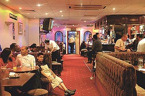In such a situation an English pub like The Hare and Goose wouldn't fit the bill. It would still be Bollywood-illiterate, it might not serve pakoras, and it certainly wouldn't have anything like the four members of the Geet Gunjan Orchestra in their equally faded crimson shirts at the Boulevard this evening. Owner Hasubhai Patel finds a free moment after coming in as Voice of Mukesh to announce himself. "I am a Mukesh fan, you know. I also sing Mukesh songs."