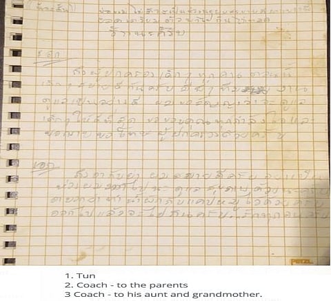 The soccer coach trapped in a cave with 12 Thai boys apologised to their parents in the first letter he and the team have sent out through divers, in which the boys say they're doing well and missing their families.