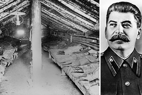 Sleeping quarters in a Siberian camp, and the man who sent millions there, Josef Stalin