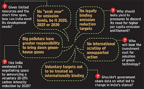 At the best of times, climate change is a mind-numbingly complex topic with the usual mix of dense jargon and data, unbending positions and posturing. But in these opaque and long-drawn-out negotiations, suddenly many observers are now intently watching India’s moves. Reason: India is seen to have yielded considerable ground right at the start of the negotiations by voluntarily committing to reduce the carbon intensity, the amount of carbon dioxide emitted per unit of GDP, by 20-25 per cent by 2020. Given that this step was taken without any quid pro quo from the rich countries (aka the big polluters), it has cast a cloud of confusion on India’s stand at the summit.