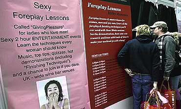 Not everyone is excited by variably torturing electro-stimulation units where "the results speak for themselves", with safety promised first to the "unsure beginner". Or the luxury love-swings with their "unique split cushion design", "breakthrough lubricants", "pocket rockets" and the "technological breakthrough" in new deforestation devices. It was some relief that "Supreme Sausages" turned out to be just a plain catering company. Bindi Ltd, the lone Indian company to participate, offered traditional mehndi designs in unusual places. Some Indian restraint.