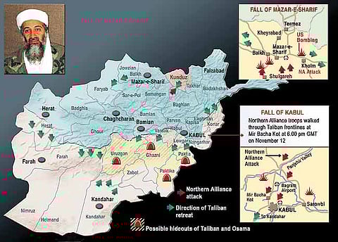 Taliban strongholds were along the Pakistan border stretching from Helmand in the south to Konar in the northeast. Following the Northern Alliance offensive, Taliban and Osama's men are hiding in these areas