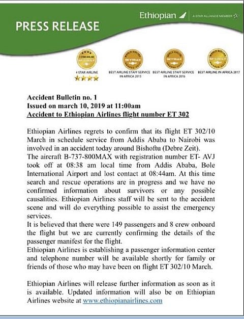 "We hereby confirm that our scheduled flight ET 302 from Addis Ababa to Nairobi was involved in an accident today," the airline said in a statement.
