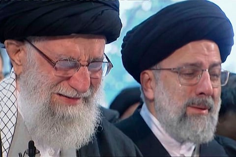 In this image taken from video, Iranian Supreme Leader Ayatollah Ali Khamenei, left, openly weeps as he leads a prayer over the coffin of Gen. Qassem Soleimani, who was killed in Iraq in a U.S. drone strike on Friday, at the Tehran University campus, in Tehran, Iran. (Iran Press TV via AP)