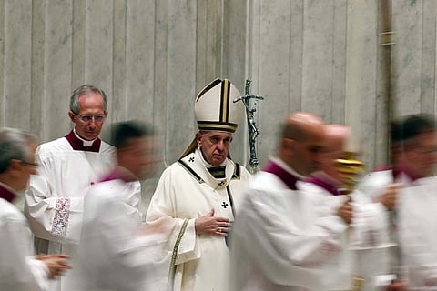 Pope Francis leaves at the end of a solemn Easter vigil ceremony in St. Peter's Basilica empty of the faithful following Italy's ban on gatherings to contain coronavirus contagion, at the Vatican. (AP Photo)
