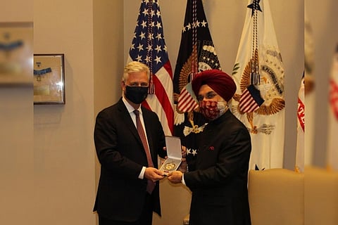 India's Ambassador to the US, Taranjit Singh Sandhu, accepted the award on behalf of the prime minister from the US National Security Advisor Robert O'Brien at the White House.