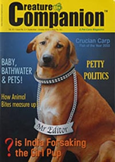 As I threatened in the Diary page a couple of issues ago, here is the complete lowdown on Editor’s debut as ‘Guest Editor’ of the magazine, Creature Companion (CC). First, my big grouse. I have been an editor for over 30 years and no publication has thought it fit to put my handsome mug on the cover. Meanwhile, our Mr Editor sits casually on the cover of CC looking smug, regal and condescending, as if he is bored by all the trashy publicity and fuss made about him in the media. In his Editorial, like most editors of the other, inferior kind, he’s a real windbag. He pontificates on a host of issues (mercifully, he is silent on the Ayodhya verdict), from inbreeding, to the girl pup, to being born in a ditch, to his fellow strays. He even thinks he has a sense of humour. He ends the editorial with a silly joke: ‘To all at the magazine, and to you my animal-loving readers, a woof and lick from me.”