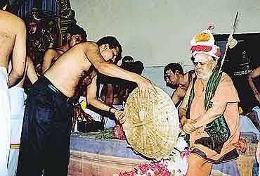 It was Appu who allegedly hired the six killers. Also a devotee of Jayendra Saraswati, he's been involved with the math for over two years. The police have confiscated photographs and video-recordings showing the Shankaracharya with Appu. One such photograph—taken a few weeks before the murder at a marriage the Shankaracharya graced—features a shirtless Appu offering paadapuja to Jayendra Saraswati. Police say Appu was earlier an associate of senior DMK leader Arcot N. Veerasamy, minister in the 1996-01 Karunanidhi government. "It was while working for Veerasamy that Appu became powerful in the city," says a police officer.