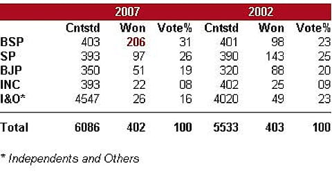 In the process, the BSP has turned the old Congress constituency -- the Brahmin, Muslim,Dalit combine -- on its head. Only, in Mayawati’s brave new world, instead of the Brahmins being in the driver’s seat, it is theDalit: indeed, she has done what her mentor and creator of the BSP, Kanshiram, had dreamt of -- she has turned the pyramid upside down. And so, for the first time after 1991, when the BJP won an absolute majority in Uttar Pradesh, the state has voted for single party rule and stability, ending 14 years of messy coalition governments.