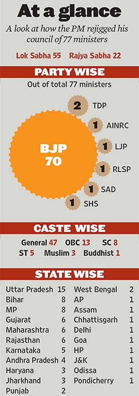 A delightful story doing the rounds in Lutyens’ Delhi says a lot about politics in the national capital. In the initial list of MPs to be inducted into the ministry, it seems, the name of C.R. Chaudhary from Rajasthan did not figure. But once the list was leaked, BJP circles pointed out that P.P. Chaudhary, a Supreme Court advocate from Rajasthan whose name was on the list, was not, in fact, a Jat; he belonged to a community known as Seervi. That was when the other Chaudhary, a Jat, was hurriedly added to the list. Apocryphal or not, the story takes away some of the shine from the carefully orchestrated ‘stories’ about the managerial precision with which the Narendra Modi and Amit Shah carried out the ministerial reshuffle.