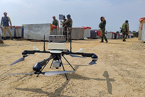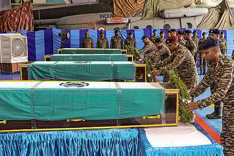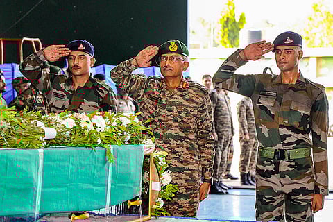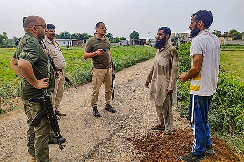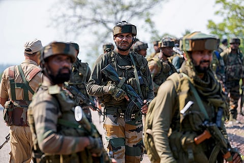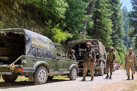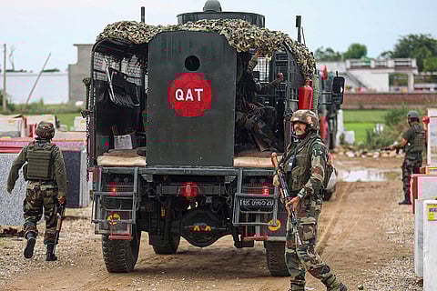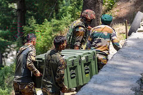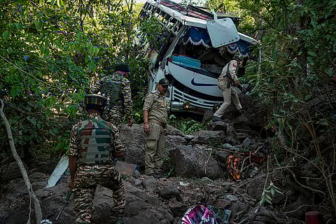 Indian army soldiers patrol the area where a bus fell into a deep gorge on Sunday after being fired at by suspected militants in Reasi district, Jammu and Kashmir, Monday, June 10, 2024. The bus was carrying pilgrims to the base camp of the famed Hindu temple Mata Vaishno Devi when it came under attack killing at least nine people.