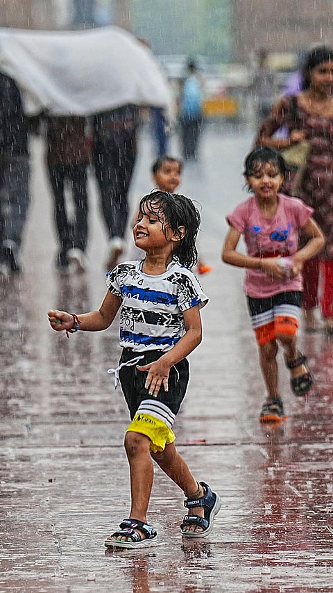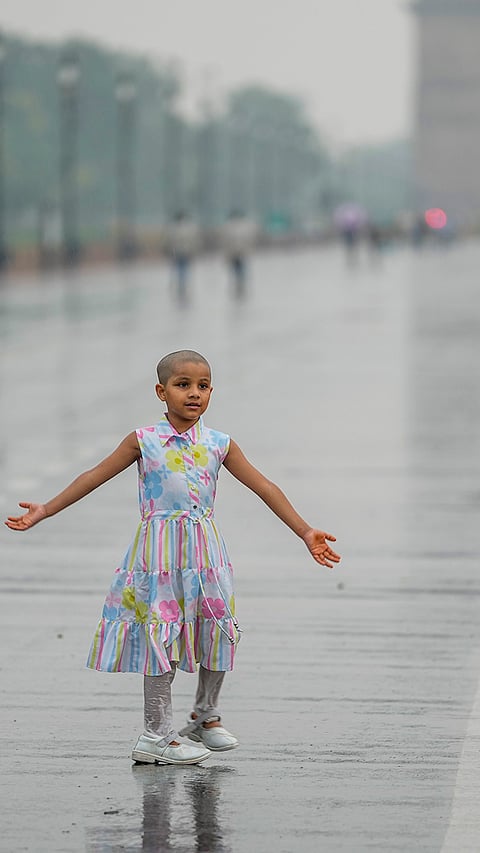 A child poses for photos at Kartavya Path amid rain, in New Delhi.