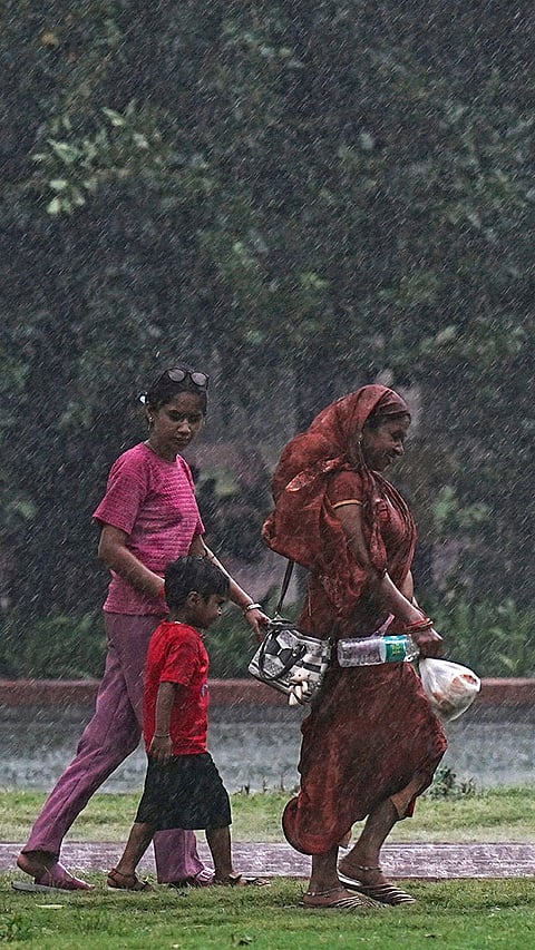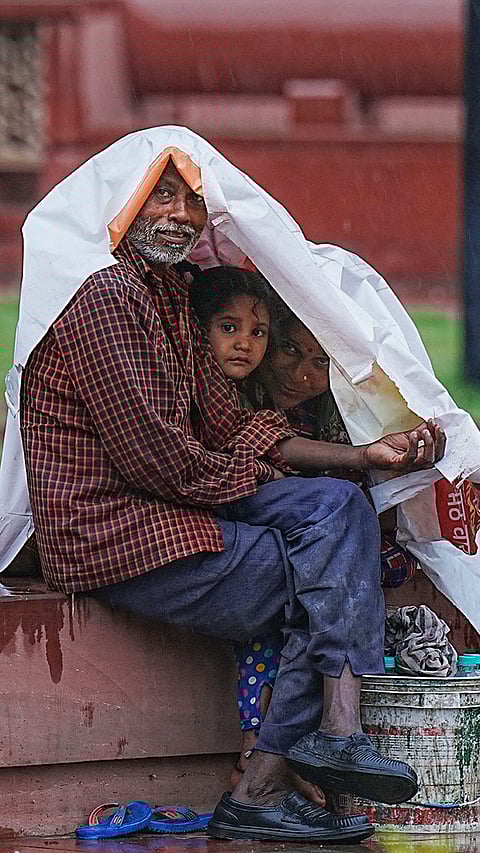 A family uses a plastic sheet for cover during rain, at Kartavya Path, in New Delhi.