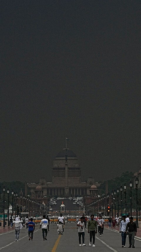People visit Kartavya Path as dark clouds hover in the sky, in New Delhi.