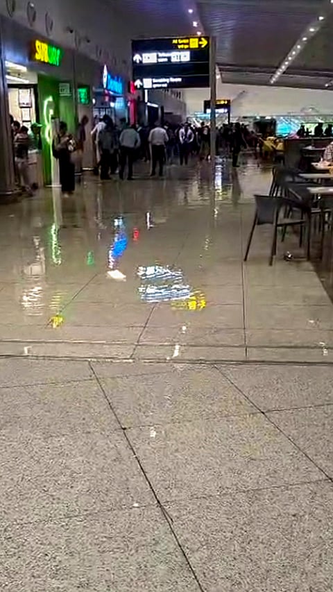 Waterlogged food court of Terminal 1 at Indira Gandhi International Airport after heavy rainfall, in New Delhi.