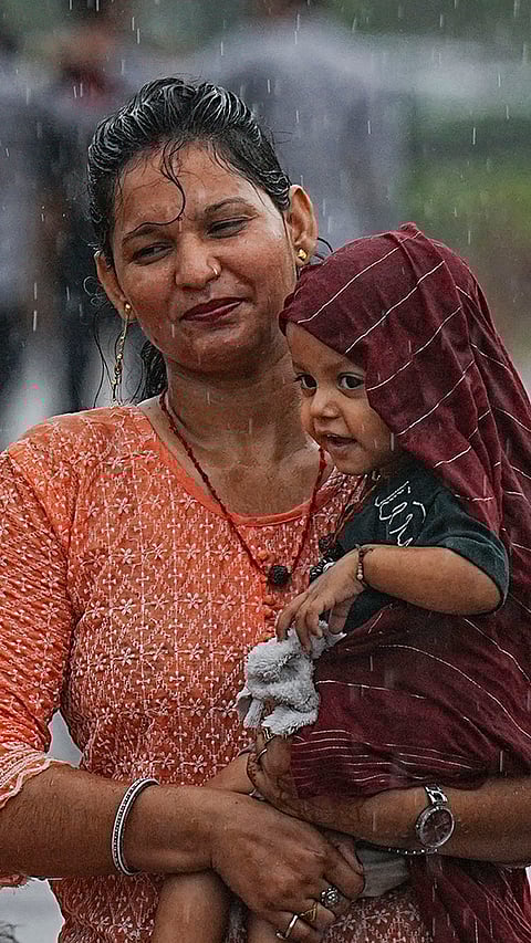A woman covers her child with a scarf during rain, at Kartavya Path, in New Delhi.