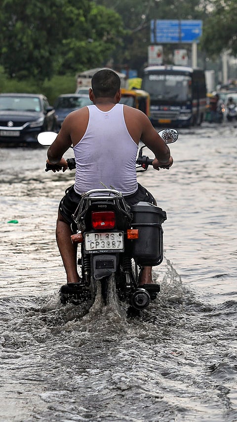 Vehicles move on a waterlogged road after heavy rainfall, at Wazirpur, in New Delhi.