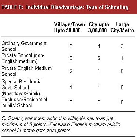 Tables B and C work in a similar manner for determining individualdisadvantage. For these tables, all group variables are excluded. Table B looksat the type of school the person passed his or her secondary examination from,and the size of the village, town, or city where this school was located. Anyonegoing to an ordinary government school in a village or small town gets themaximum of 5 points in this matrix. The gradation of schools is done accordingto observed quality of education and implied family resources, and this couldalso be refined. A student from an exclusive English medium public school in alarge metro gets no disadvantage points.