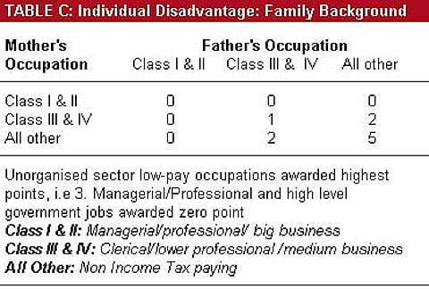 Table C looks at parental occupation as a proxy for family resources (thatis, income wealth, etc., which are notoriously difficult to ascertain directly).Since this variable is vulnerable to falsification and would need some effortsat verification, we have limited the maximum points awarded here to three.Children of parents who are outside the organised sector and are below thetaxable level of income get the maximum points, and the occupation of bothparents is considered. Those with either parent in Class I or II jobs of the government, or in managerial or professional jobs get no points at all.Intermediate jobs in the organised sector, including Class III and IV jobs inthe government, are reckoned to be better placed than those in the unorganised,low pay sector.