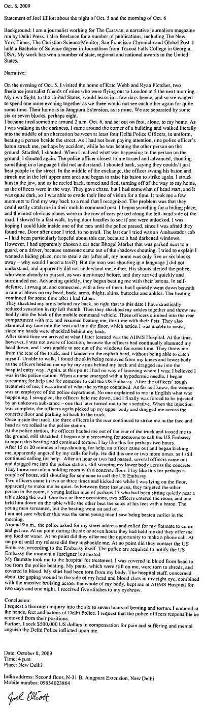 I became tired sometime around 2 a.m. Oct 6, and set out on foot, atone, to my home As I was walking in the darkness, I came around the comer of a building and walked literally into the middle of an altercation between at least four Delhi Police Officers, in uniform, beating a person beside the street. As I had not been paying attention, one police officer's baton struck me, perhaps by accident, while he was beating the other person on the ground. Startled. I shouted. When I realized what was happening to the person on the ground, I shouted again. The police officer closest to me turned and advanced, shouting something in a language I did not understand. I shouted back, saying they couldn't just beat people in the street. In the middle of the exchange, the officer swung his baton and struck me in the left upper arm area and began to raise his baton to strike again. I struck him in the jaw, and as he reeled back, turned and fled, turning off of the way to my home, as the officers were in the way. They gave chase, but I had somewhat of head start, and it was quite dark, so I was able to evade their line of vision for a time. It took me a few moments to find my way back to a road that I recognized. The problem was that they could easily catch me in their mobile command post. I began searching for a hiding place, and the most obvious places were in the row of cars parked along the left hand side of the road. I slowed to a fast walk, trying door handles to see if one were unlocked. I was hoping I could hide inside one of the cars until the polite passed, since I was afraid they found me. Door after door I tried, to no avail. The last Car I tried was an Ambassador cab -- I had been particularly hopeful about this car, because it had darkened windows. However, I had apparently chosen a car near Bhogal Marker that was parked next to a guard, or a driver, because someone came out of the shadows shouting. I tried to explain I wanted a hiding place, not to steal a car (after all my home was only five or six blocks away - why would I need a taxi?) But the man was shouting in a language I did not understand, and apparently did not understand me, either. His shouts alerted the police, who were already in pursuit, as was mentioned before, and they arrived quickly and surrounded me. Advancing quickly, they began beating me with their batons. In self-defense, I swung at, and connected, with a few of them, but I quickly went down beneath a rain of blows on my head, back, arms, thighs, shins, buttocks and ankles. The beating continued for some time after I had fallen.
