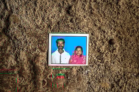 Passport photo of husband and wife together that Munni Devi points at while tells us about her husbands alleged suicide.
