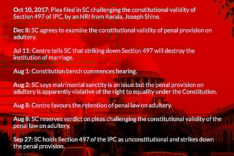 Chief Justice Dipak Misra and Justices A M Khanwilkar and R F Nariman held that Section 497 of the Indian Penal Code dealing with the offence of adultery is unconstitutional.