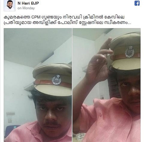 Ambily had shared the picture with his friends over WhatsApp but later the photo went viral on social media, after N Hari, BJP's Kottayam district President posted the same photo on his Facebook page. He captioned the picture saying: "Police provide a warm welcome to Ambiliy, who is a history sheeter and a CPI (M) goon from Kumarakom."