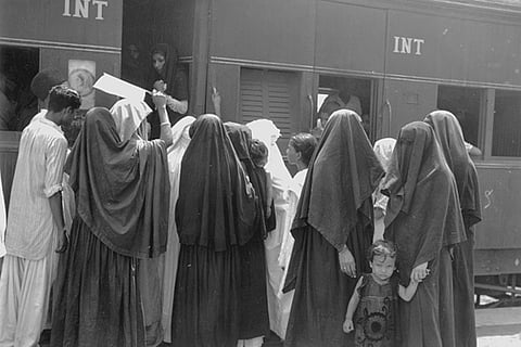 Muslim women boarding a train at New Delhi in India to travel to the newly independent Pakistan.