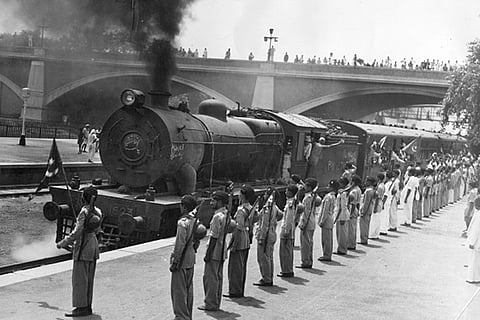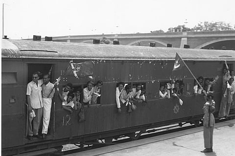One of 30 special trains leaving New Delhi Station which will take the staff of the Pakistan government to Karachi. Muslim League National Guards stand to attention in honour of the departure. 600 Delhi muslims were relocated to Pakistan following the partition.