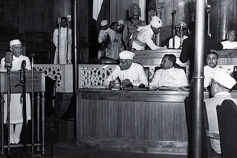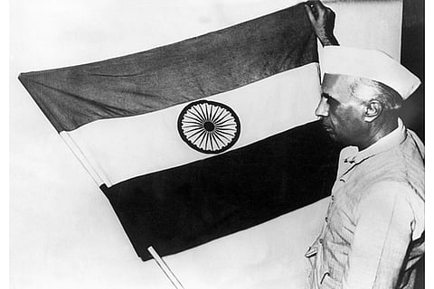 The vice President of India, Jawaharlal Nehru, presenting the national flag of India during a meeting of the constituent assembly, the flag is made up of three colors: saffron, white and green with the wheel of the Asoka in the center symbolizing unity on July 30, 1947.