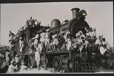 Muslim refugees fleeing India for Pakistan crowd train engine, 1947. Gelatin silver photograph shows Muslim refugees fleeing India for Pakistan. They are crowding the train engine in their panic and desperation to leave the country.