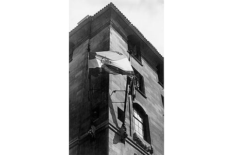 15th August 1947: A flag of the new Dominion of India unfurls outside India House, London.