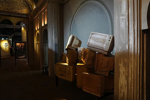 This year, Behala Friends’ Club presents “Nabanna”—a theme that reflects the aftereffects of war through hunger, wounds, and genocide. The pandal signifies economic downfall and global hunger, mourning the countless lives lost in wars of power. By drawing a poignant connection between the Bengal Famine of 1942 and the present famine in Gaza, the pandal weaves history and reality together. Its expression is deepened by the thematic artistry of the installation and the evocative penmanship of poet Naama Hasan.