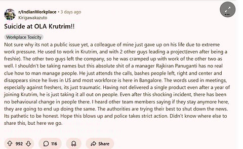 Almost a fortnight later since the dead body of a 25-year-old machine learning engineer at Ola Krutrim, an AI company owned by ride-hailing app Ola, was found in Bengaluru's Agara Lake, allegations have surfaced through Reddit posts that the engineer died by suicide owing to toxic work culture and an exploitative manager.