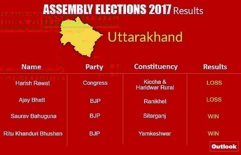 Chief Minister Harish Rawat lost from both his seats- Haridwar Rural and Kichha. He lost for BJP candidate Yatishwaranand in Haridwar Rural by 12400 votes. In Kichha, he lost for BJP’s Rajesh Shukla. BJP’s Harbansh Kapoor is leading from Dehradun Cantt,