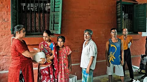 One reaches Angela Govindraj’s small flat after a dark climb where every landing has a window to bring in sunlight. The tiny kitchen—unsuitable for a single person to even work around—cannot defeat her spirit of feeding people. It is said that nobody goes empty stomach from here.