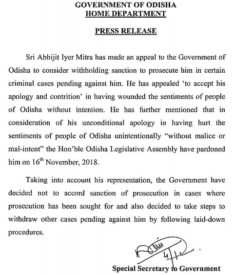 The special secretary to the Odisha government in a press release said that following Iyer-Mitra's representation to withdraw the cases against him, the government has decided to drop the charges.