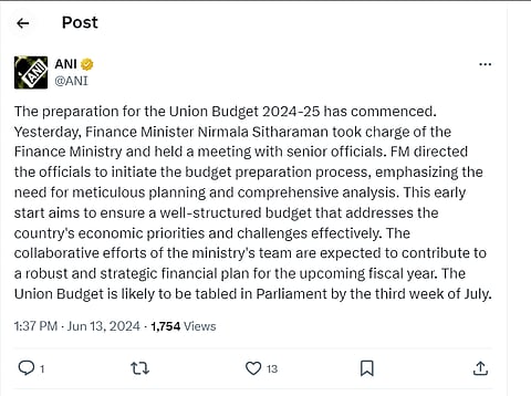 As per news agency ANI, the Finance Minister has directed officials to begin preparing the budget for the upcoming fiscal year. With this, the Finance Ministry will likely table the Union Budget 2024-25 by the third week of July.