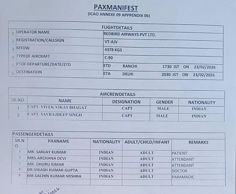 Air ambulance took off from Birsa Munda Airport in Ranchi at around 7:11 pm for Delhi