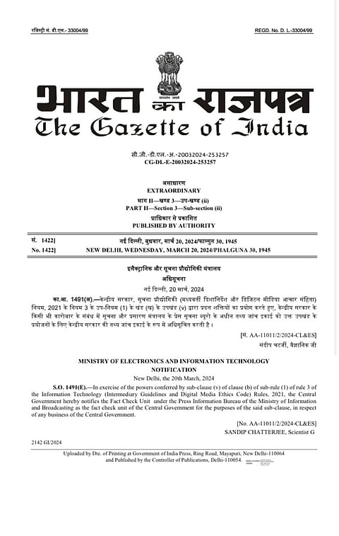 The notification stated, "The central government hereby notifies the Fact Check Unit under the Press Information Bureau of the Ministry of Information and Broadcasting as the fact check unit of the Central Government for the said sub-clause, in respect of any business of the Central Government."