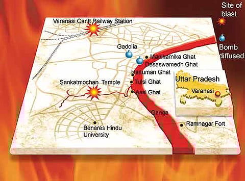 6.35 PM Varanasi cantt: A powerful blast in the waiting room on platform no. 1 leaves a crater. The train waiting on that platform was bound for Delhi.