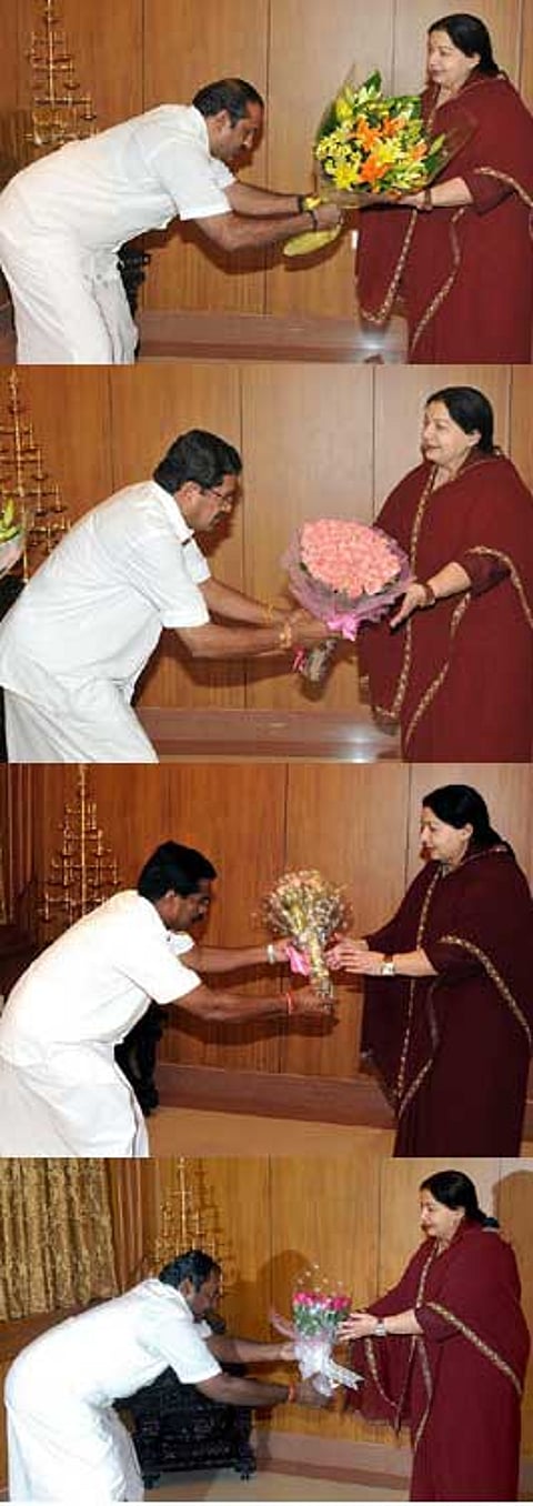 The pictures put out by the Directorate of Information and Public Relations of partymen offering flowers — bouquets are in and ponnadais (shawls) that former CM Karunanidhi was greeted with, are out since Jayalalitha assumed office on May 16 this year — to wish the chief minister on her completing 100 days as CM are revealing and a little amusing. There are some partymen who almost bent over double while offering flowers, so much in awe and reverence do they hold amma. They used to say about former PM Indira Gandhi that she was the only man in her cabinet. Even if it is politically incorrect to employ such a description now, many would say Jayalaalitha is the only man in hers. Because there is no evidence that she wants it any other way, it is safe to assume that she seems to like it that way, even if MLAs display abject sycophancy in the assembly. Unlike Karunanidhi who has rapped partymen publicly many times for heaping encomiums and comparing him to the great-poet saint Thiruvalluvar.