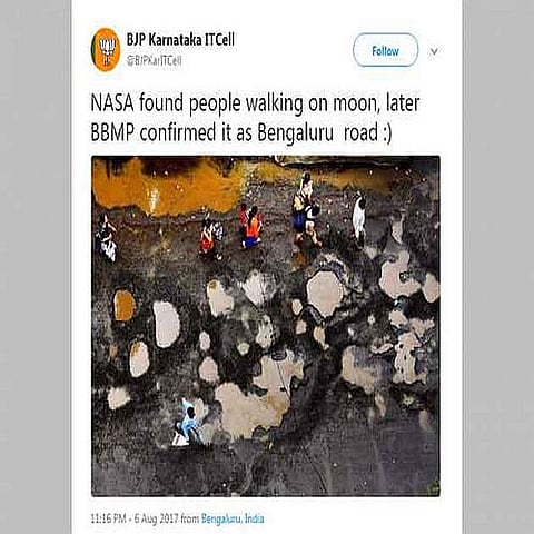 The IT cell tweeted and shared the picture on its Facebook wall claiming: “NASA found people walking on moon, later BBMP confirmed it as Bengaluru road :)” Karnataka BJP chief and former chief minister B.S. Yeddyurappa and Union minister of statistics and programme implementation Sadananda Gowda follow the IT cell on Twitter.