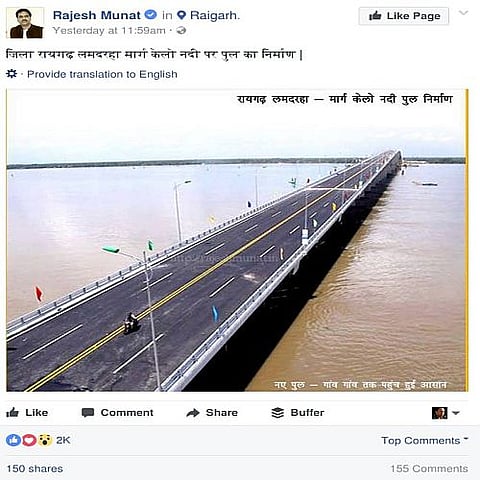 In a facebook post shared yesterday, the Chhattisgarh minister captioned the image of a bridge 'Zila Raigarh lamdarah marg kelo nadi par pull ka nirman' roughly translated as 'Inauguration of the bridge over River Kelo on Lamdarha Marg in District Raigadh.'
